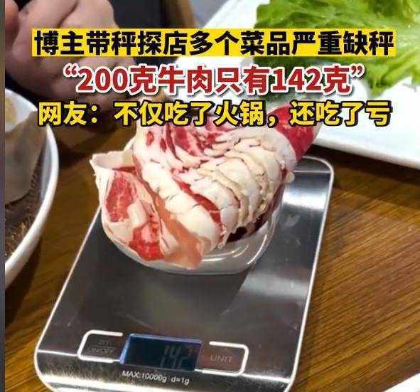 他率先来到了在川渝地区十分有名的龙门阵火锅。B少先是各点了一份200克的肥牛和羊肉,还有标注为120克的毛肚,随后又礼貌性地询问了一句食材够不够称,可当他把毛肚放上称的那一刻,却瞬间令服务员啪啪打脸,毛肚只有82克,牛肉只有176克,羊肉182克,全都不同程度的缺斤少两,而面对她的质疑,服务员的态度却令人大开眼界,上菜大姨不禁语气淡定的表示,也就是少了两滴水的重量。