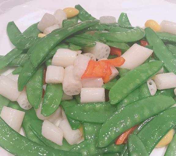 1,藕带洗干净切丁,荷兰豆两头拉丝洗净备用,再切点彩色椒点缀。