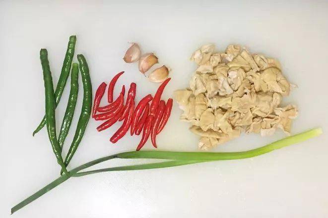 肥肠、青椒、小米椒、大蒜、蒜叶
