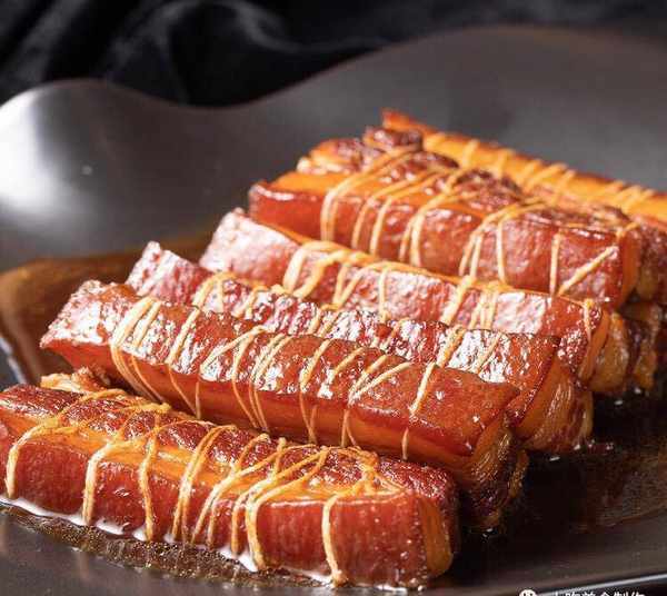2.五花肉切成长约15cm,厚约1.5cm-2cm的大块,用绳子扎紧固定形状,锅烧热,将大块猪肉放入锅中煎至微焦两面焦黄,取出备用。