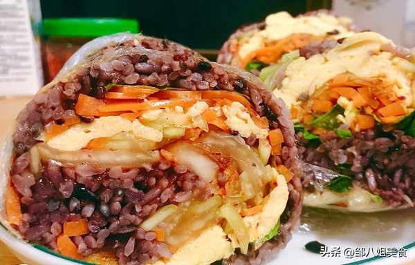 案板上铺上保鲜膜,放入适量黑米,依次放入生菜、胡萝卜、鸡蛋、泡菜、黄瓜、黑米。存放后,将保鲜膜收起来,包紧。处理好后,用刀对半切开,饭团就做好了。