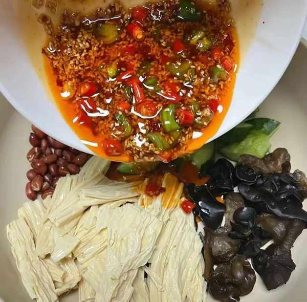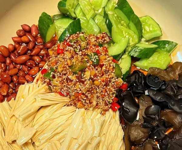 配料表:腐竹、木耳、黄瓜、花生米、大蒜、青辣椒、小米、白芝麻、酱油、白醋、蚝油、香油、糖、盐