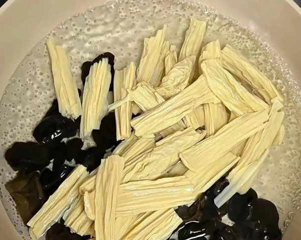 第一步是将腐竹和木耳提前用水泡好,然后捞出洗净。