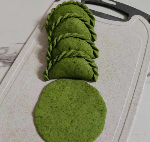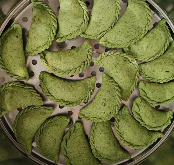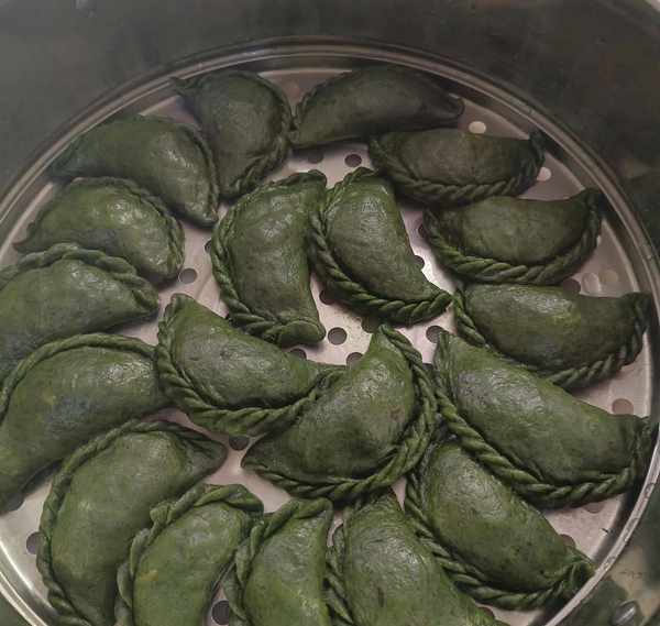 接下来,一个一个挤成面团,擀开皮,包上炒好的菜,上蒸锅蒸13分钟。