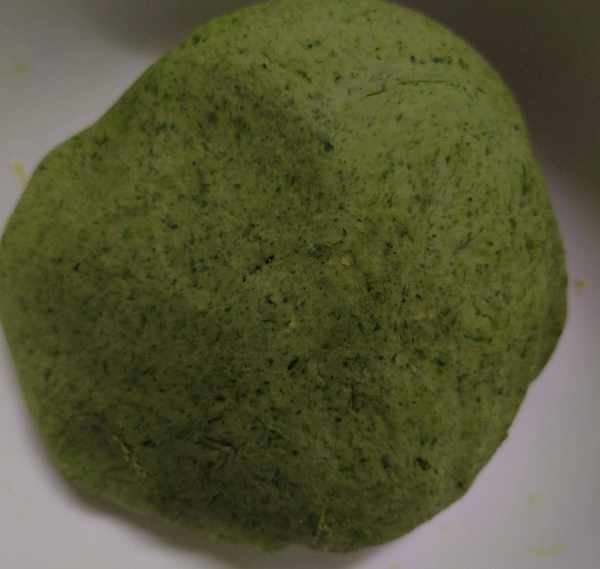 在搅拌的同时,加入一团已经煮沸的艾草。