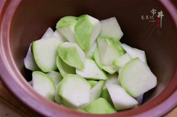 3、合适的炖锅底部加入辅料,这里用的是萝卜,也可以是莲藕等食材,炖锅我用的是电炖锅,非常的方便炖东西。