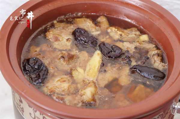 4、加入焯过水的排骨,加入4颗大枣,加姜片,加少量花椒,就这3样东西调味即可,根据个人口味加适量的盐,加入没过排骨的开水。