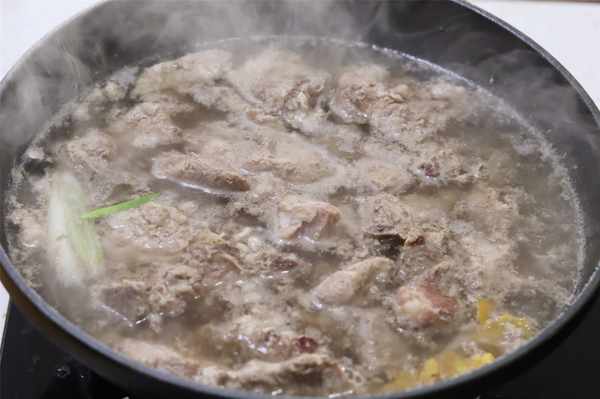 1、清炖排骨必须要焯水,否则吃起来很可能有腥味,影响口感,排骨多冲洗几遍,冷水放入锅中,加入一些葱段,橘皮,料酒中火煮开。
