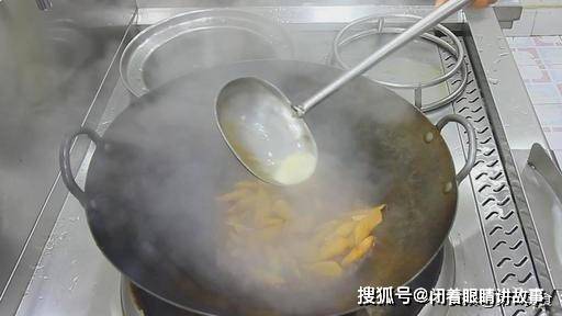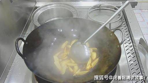 放入茭白,炸制大约30秒钟,捞出茭白,控干油备用。
