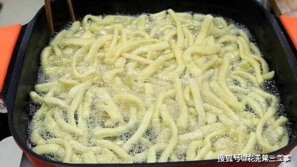 锅内烧油, 油温5成热时 ,把切好的窄条放入油锅,炸的过程要用筷子不停的翻动