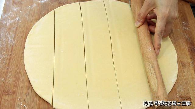 擀好以后 ,用擀面杖档住切成5厘米左右的宽条。