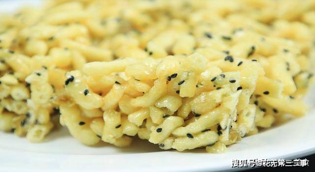 把白糖和蜂蜜熬制粘稠起泡,关火起锅倒在炸好的面条上面,倒的时候要用锅铲不停的翻动