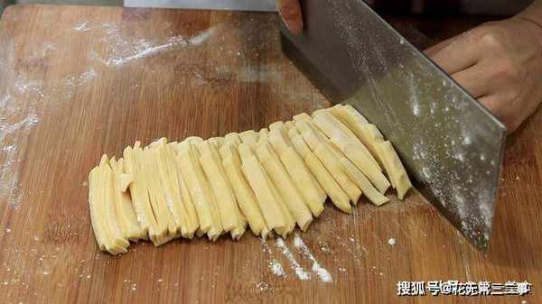 撒上一点面粉 ,免得粘在一起,把宽条摞在一起, 切成1厘米左右的窄条。