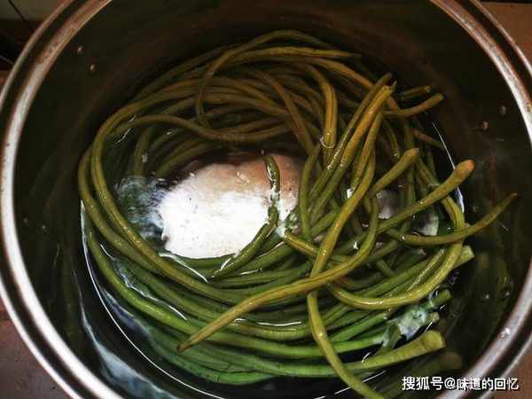 1、首先我们准备一把长豆角,把它们择洗干净,放入开水锅中焯烫一到两分钟,水中可以加入一点食盐,这样可以让豆角的颜色更翠绿,焯好之后,放入冷水中泡一下。