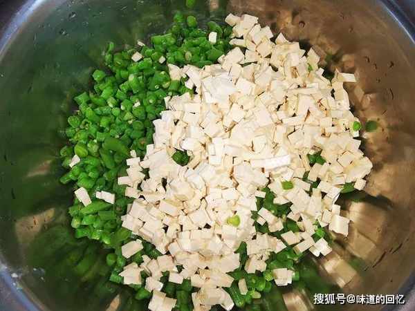 4、准备一块老豆腐,切成小块,放入豆角末中。