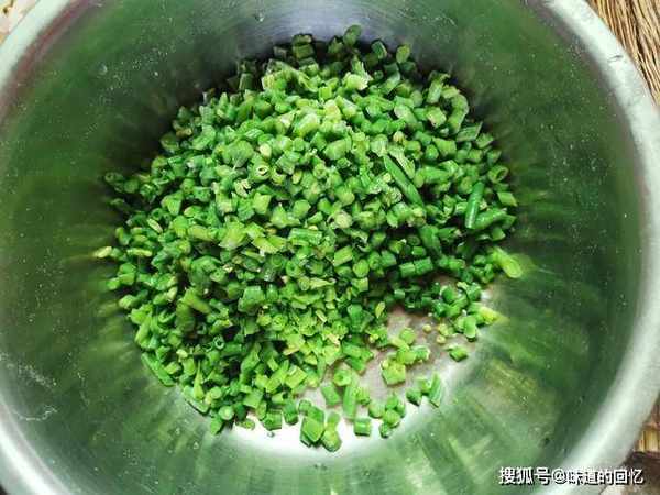 2、泡好的豆角,放入案板上,切成碎一点的豆角末,放入大盆中备用。