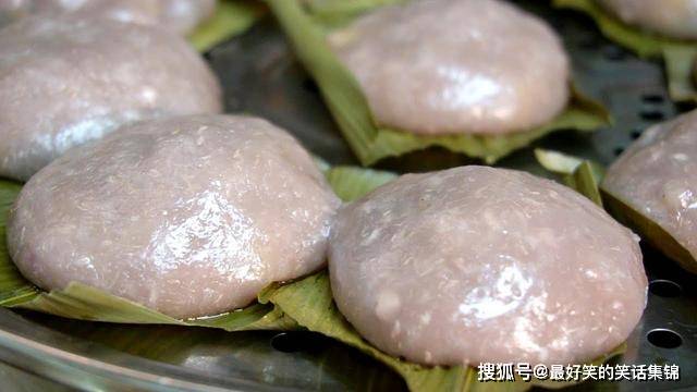 3、接着将团子放在香蕉叶上,上锅蒸10分钟,芋头糍粑就完成,吃起来香软,很Q弹,非常好吃。