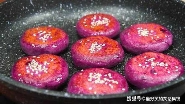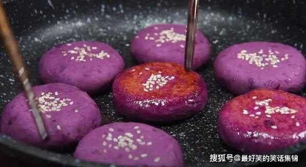 2、面团分成均匀小份,搓成小圆饼早上,双面粘上芝麻。平底锅刷油,将红薯饼放上面煎。