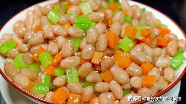 3、花生、胡萝卜、芹菜放碗中,加食盐、白糖、芝麻、香油、五香粉,最后淋上热油,拌均匀就可以吃。