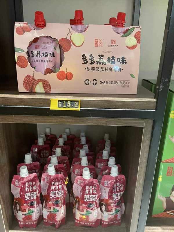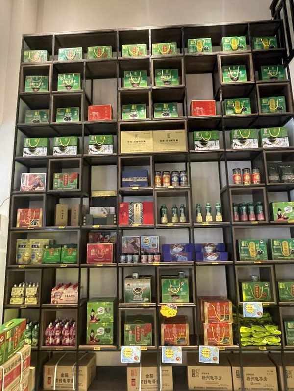 一楼处还放置了一个巨大的展览架,架子上面放置了许多龟苓膏的产品。上面不仅有传统的原味浓缩型龟苓膏粉,还有新推出的玫瑰、荔枝、枇杷雪梨口味的果冻口感的龟苓膏。这让大家来品尝龟苓膏的同时还能随手带一两件带回家。