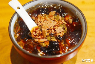 全部晾凉后的冰粉非常Q弹,看上去就很清凉,做好的冰粉也可以放在冰箱里冷藏,吃起来会更加清凉。晾凉后的红糖浆也变得非常浓稠,看着特有食欲。然后我们取出一个碗,将晾凉的冰粉用勺子挖入碗中,吃多少挖多少,再淋上适量的红糖浆调味,适当的搅拌一下,还可以再加一些山楂碎、葡萄干、水果和核桃碎之类的,口感会更加丰富,冰凉爽口,非常适合夏天,这就是标配版的冰粉。