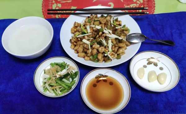 陈老自家吃的炒疙瘩,搭配醋、蒜、咸菜和面汤