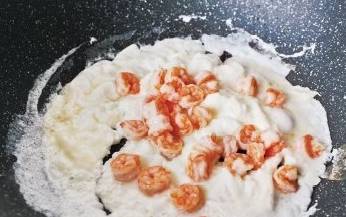 鲜虾仁100克、盐1克、胡椒粉0.3克、水淀粉1勺、牛奶50毫升、玉米淀粉5克、火腿末20克、盐2克、油1.5勺