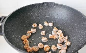 ③锅中倒油烧热,放入腌好的虾球滑熟至打卷变色,盛出。