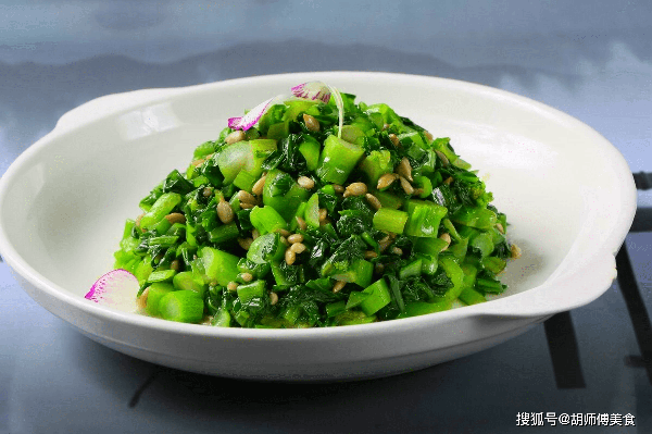 【食材准备】:白菜苔一把、新鲜瓜子仁30克、猪油15ml、食盐、蒜末、鸡精适量。