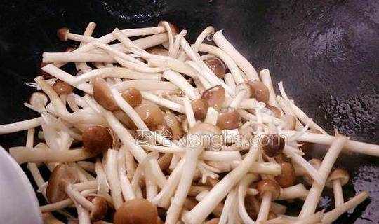 7.最后放入煸炒好的茶树菇,放入少许盐,生抽,味精,