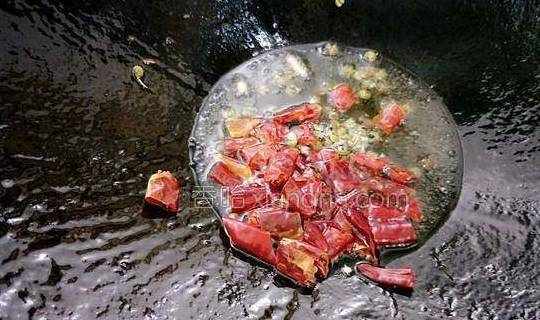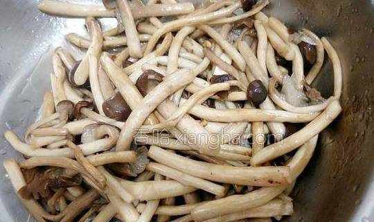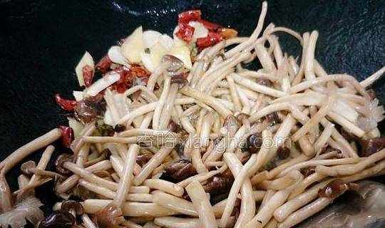 2.热锅凉油,下入茶树菇干煸,(煸炒3.4分钟,就可以起锅备用了)