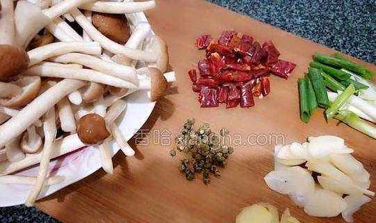 配料:新鲜茶树菇350克、花椒粒少许、干辣椒适量、姜片适量、蒜片适量、大葱一根、生抽适量、盐少许、玉米油适量