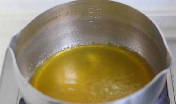 4、橙汁倒入锅中加15克细砂糖煮开,吉利丁片捞出来沥干水分,加入橙汁中搅拌均匀,倒入模具中。