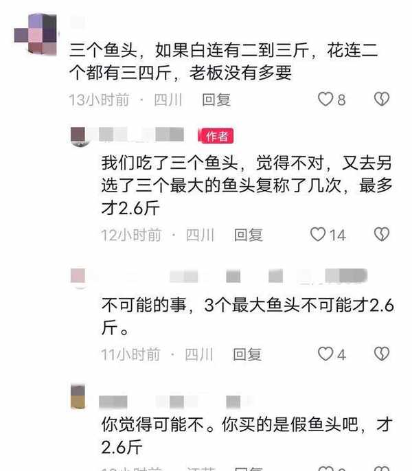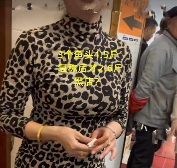 她所点的是3个鱼头4.5斤,复称时挑了3个最大的,结果也就只有2.6斤,