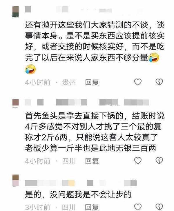既然感觉到鱼头分量不对劲,吃完后也去找店长理论过,只是店长不承认缺斤少两,她就提出要复称了。