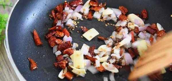 6.锅中留底油,倒入2g花椒、30g干辣椒段,炒香后倒入8g蒜片、5g姜片、15g洋葱粒,翻炒均匀;