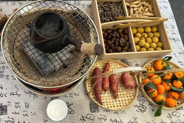 冬日午后,生一炉炭火、烧一壶热茶,桌上码放着花生、桂圆、栗子之类的干果,烤上几颗橘子或柿子,茶香袅袅,炉火氤氲,与三五好友围坐,边喝茶边说笑,偷得浮生半日的清闲。