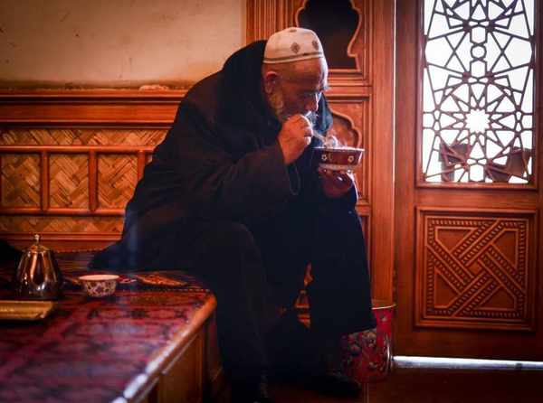 因此,南疆在煮茶用具上和北疆也有所差异,大多用带着滤网的铜质长颈茶壶,这样方便过滤香料和茶渣,而喝茶则用小茶碗。