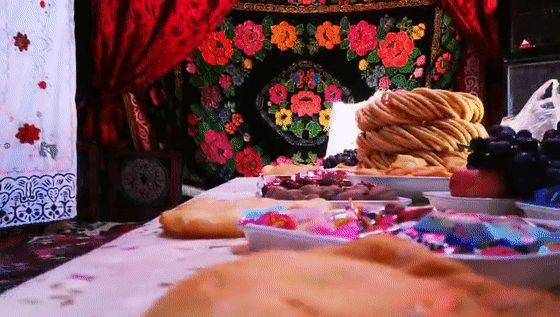 画面一转,只见炕上立着一方木桌,桌上齐整摆放的或是精致亮眼的玻璃器皿,盛放着各式的干果甜点。