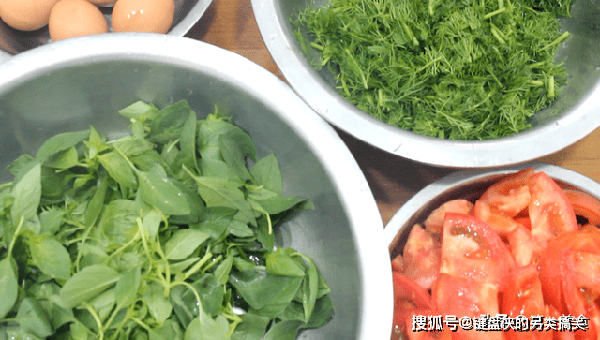 洗净的小茴香一把,切成段,荆菜叶一小把,放入盆中,再打几个鸡蛋搅匀用来打蛋花。