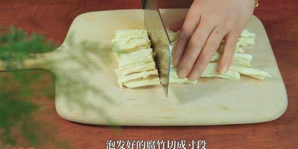 1、将泡发好的腐竹切成段备用。大家好好是小园一餐,爱做家常菜,关注我分享美食小技巧。