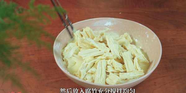 3、将切好的腐竹段,放到调制好的面糊中搅拌均匀。大家好好是小园一餐,爱做家常菜,关注我分享美食小技巧。