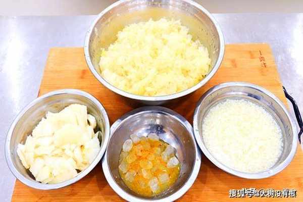 提前把银耳放凉水中浸泡一个小时,泡发以后去除黄色的硬根,剪成小块,银耳一定要用凉水泡,口感才会清脆,用热水泡出来比较绵软,而且不容易出胶;准备一个雪梨,去除梨核后切成片;碗中放入一把冰糖,加入适量的桂花酱增加鲜甜味;另外准备适量的米酒备用。