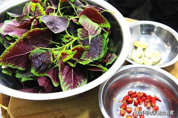 准备几个小米椒,切成辣椒圈;新鲜的苋菜一把,切去根部放入盆中,加入一勺食盐用清水泡上,淡盐水浸泡能有效减少苋菜的农药残留物。再准备适量的大蒜,捣成蒜泥备用。