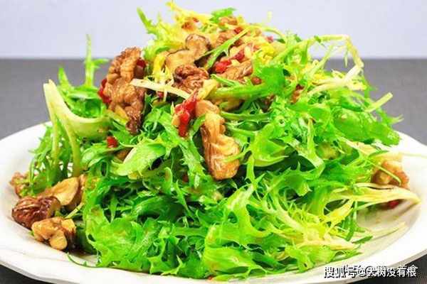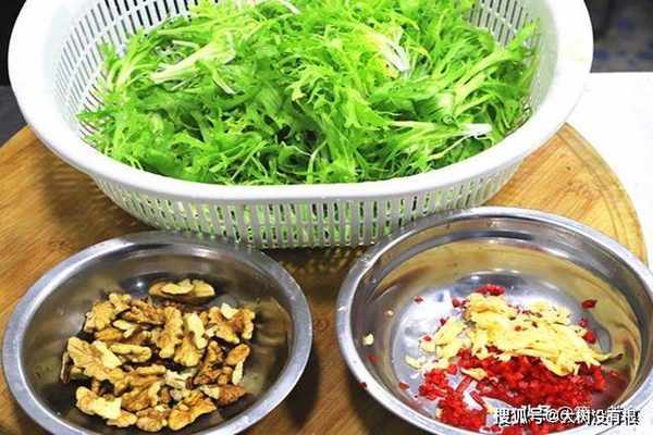 把切好的红椒粒、大蒜末倒入盆中,加入食盐2克,白糖2克,味精1克,生抽10克,几滴老抽上色,色拉油5克搅拌均匀,然后放入沥干水的苦菊,加入核桃仁颠盆拌匀,就可以装盘食用了。