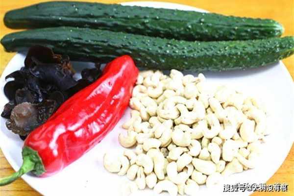 首先,我们准备两根黄瓜,把外皮削干净,去除瓜瓤切成菱形块;半个红椒切成片,用来搭配颜色,一小把泡发的木耳 去除硬根、切成小块,再准备适量腰果仁备用。