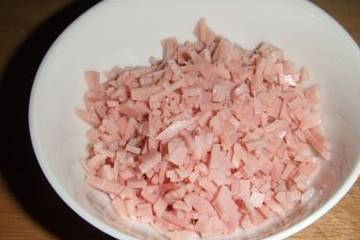 1、火腿切丁(我用的是方片三明治火腿,你可以选择自己喜欢吃的任何口味的火腿。)