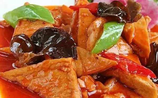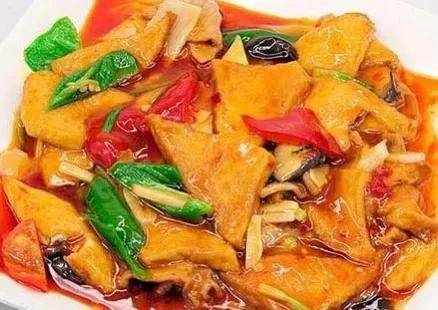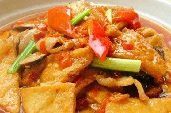 4、再倒入青红椒、香菇、炸豆腐,翻炒均匀,加入热水、盐、鸡精、十三香,约30分钟。煮5分钟。