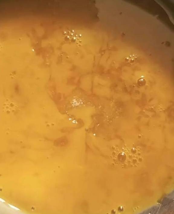 打两个鸡蛋至碗里搅拌均匀。淋在馒头丁上面继续煎。