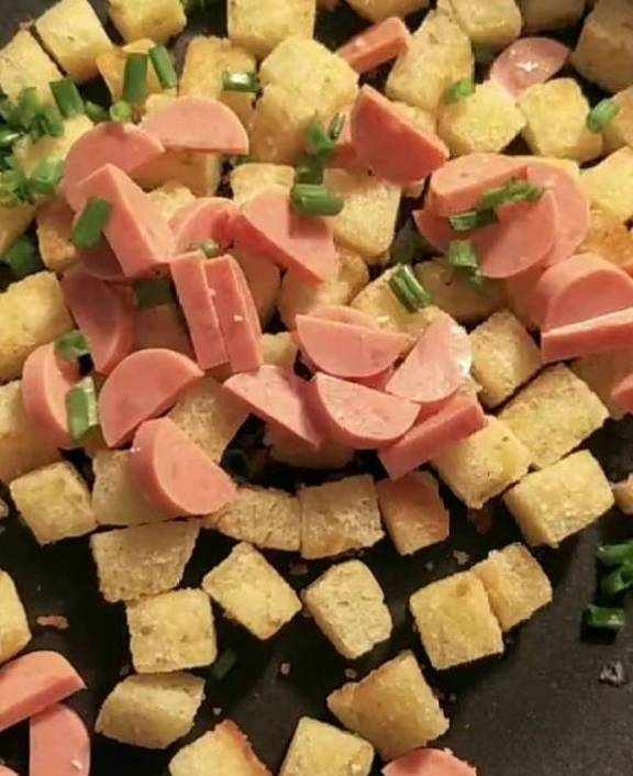 然后葱花切段,火腿肠切片依次加入馒头丁里继续翻炒。